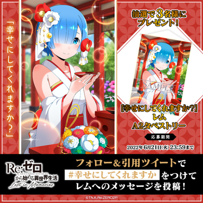 内容:『リゼロス』公式Twitter(https://twitter.com/re_zero_rezelos)をフォローして、キャンペーンツイートを引用&ハッシュタグ「#幸せにしてくれますか」をつけて、レムへのメッセージを投稿すると、「【幸せにしてくれますか】レム A2タペストリー」を抽選で3名様にプレゼントするキャンペーンを開催します。