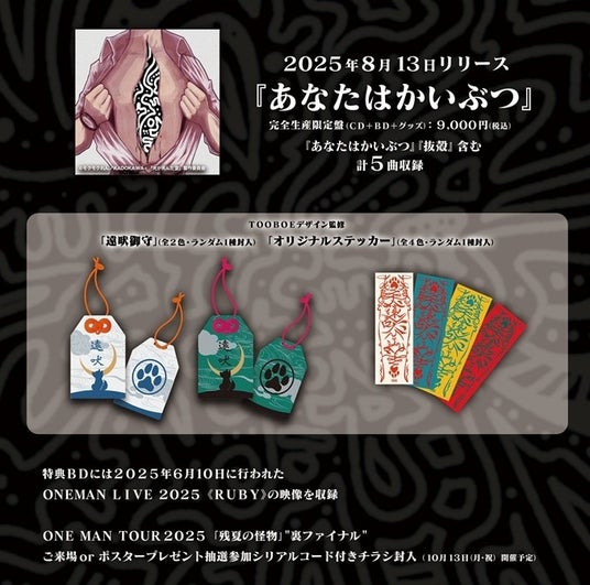 8月13日にリリースされる「あなたはかいぶつ」CDには、全五曲を収録。ジャケットはTOOBOEによる書き下ろしとなっている。Blu-rayには行われたばかりの『TOOBOE ONEMAN LIVE 2025《 RUBY 》』のライブ映像が収められるほか、グッズとしてTOOBOEがデザインを監修した「遠吠御守」(全2色・ランダム1種封入)「オリジナルステッカー」(全4色・ランダム1種封入)が付属する。さらに、”ONE MAN TOUR 2025「残夏の怪物」裏ファイナル”と題したシークレットライブを10月13日(月・祝)に開催することが決定。シークレットライブご来場もしくはポスタープレゼント抽選参加シリアルコード付きチラシが封入される。