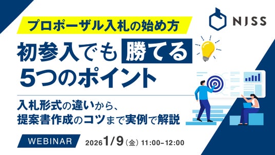 本セミナーでは、プロポーザル入札を始めたい企業様に向けて、組織体制の理解から提案書作成、差別化の打ち出し方まで5つのポイントを解説します。後半では実際の公示書・仕様書を画面で映しながら、「どこを見ればいいのか」を具体的にご紹介しますので、セミナー後すぐに案件探しを始められます。