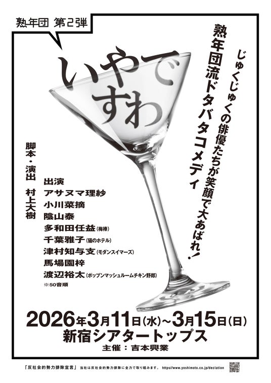 熟年団 第2弾公演『いやですわ』が2026年3月11日(水)~3月15日(日)までの5日間、新宿シアタートップスにて開催されることが決定しました。