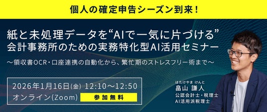 株式会社クリーク・アンド・リバー社の会計分野の子会社であるジャスネットコミュニケーションズ株式会社(JC)は、個人の確定申告シーズンを目前に控えた2026年1月16日(金)に、会計事務所の実務担当者を対象としたオンラインセミナー「紙と未処理データを“AIで一気に片づける” 会計事務所のための実務特化型AI活用セミナー」を開催します。