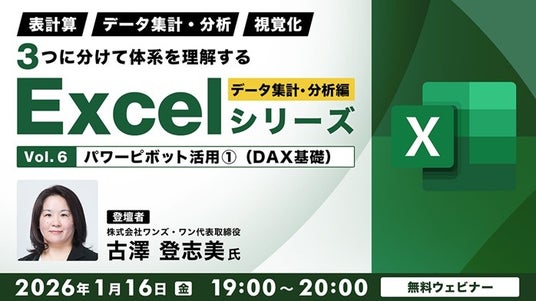 株式会社クリーク・アンド・リバー社(C&R社)は2026年1月16日(金)・30日(金)、普段からExcelを使用されている方を対象に無料のオンラインセミナー「『表計算』『データ集計・分析』『視覚化』3つに分けて体系を理解するExcelシリーズ データ集計・分析編 Vol.6/Vol.7」を開催します。