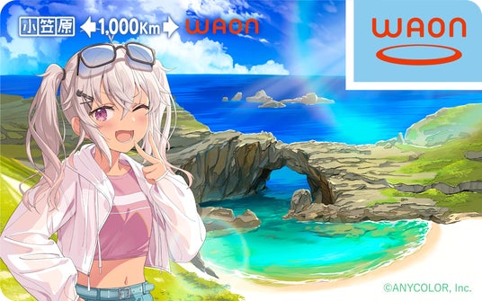 コラボレーションカード5枚目は「小笠原←1,000km→WAON」。小笠原諸島の南島を旅する「魔使マオ」さんを撮りおろしたオリジナルデザインカードとなります。お買物いただいたご利用金額の一部が、世界自然遺産小笠原諸島の環境保全を応援します。
