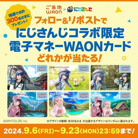 9月6日(金)から9月23日(月・祝)までの期間中、ご当地WAONと「にじさんじ」のコラボレーションを記念して、X(エックス)の電子マネーWAON公式アカウントにて、プレゼントキャンペーンを実施します。