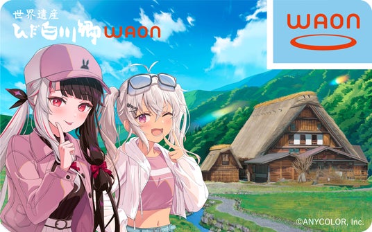 コラボレーションカード2枚目は「世界遺産 ひだ白川郷WAON」。岐阜県白川村の白川郷の「合掌造り集落」を旅する「夜見れな」さんと「魔使マオ」さんを撮りおろしたオリジナルデザインカードとなります。お買物いただいたご利用金額の一部が、「世界遺産合掌造り集落保存協力寄付金」に寄付されます。