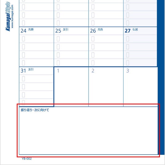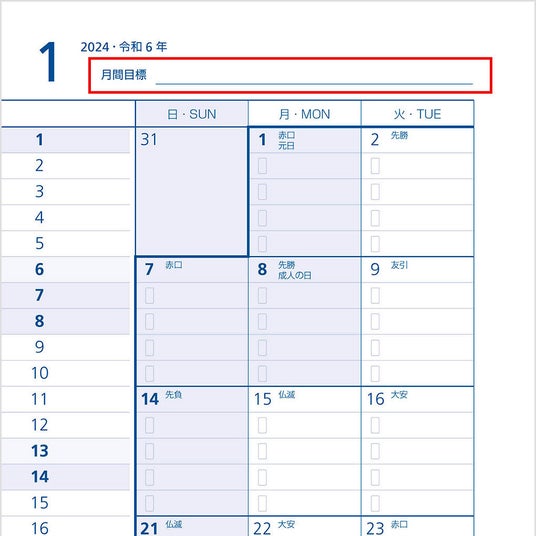各月の最初に、その月の目標を設定できる欄を追加しました。目標を明確にし、月間の計画を立てる際の指針とすることで、計画的な行動を促進します。
