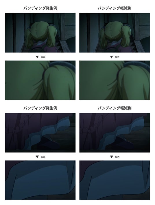 「DMM TV」では、バンディングを軽減させる様々なパラメータチューニングを行っており、特にアニメの画質向上に大きく寄与しています。