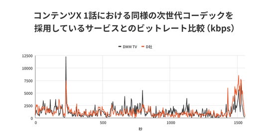 図6:コンテンツX 1話における、同様の次世代コーデックを採用している大手グローバル動画配信サービスとのビットレート比較