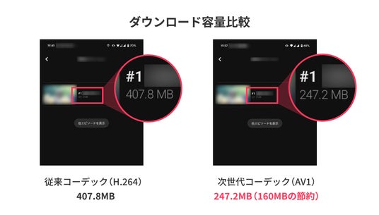 また、次世代コーデックはストリーミング視聴だけではなくダウンロード視聴にも適用されるため、スマートフォンのストレージ容量の節約にもつながり、より多くのコンテンツをダウンロードしてオフライン再生いただくことが可能になります(図2)。