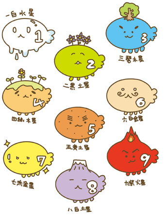一白水星、二黒土星、三碧木星、四緑木星、五黄土星、六白金星、七赤金星、八白土星、九紫火星の九つです。