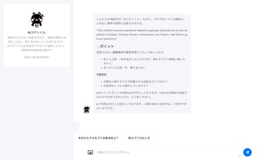 10月1日から、ごみ出しに関するお問い合わせにAIで回答するサービスを開始しました。電話の場合は夜間や休日等、対応が難しいこともございますので、このような便利なAIサービス機能もご利用いただき、住民の皆様の疑問を解決できたらと思います。ご活用よろしくお願いします。