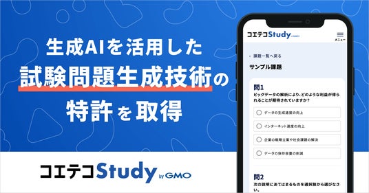 GMOインターネットグループのGMOメディア株式会社(代表取締役社長:森 輝幸 以下、GMOメディア)は、問題生成装置、問題生成方法および問題生成プログラムに関する特許を2024年10月3日(木)に取得しました(特許番号:特許第7566195号)。GMOメディアでは、AIによる問題生成技術に関する特許取得は、2024年8月に取得した「クイズGPT(特許番号:特許第7546809号)」(※1)に続き2件目となります。