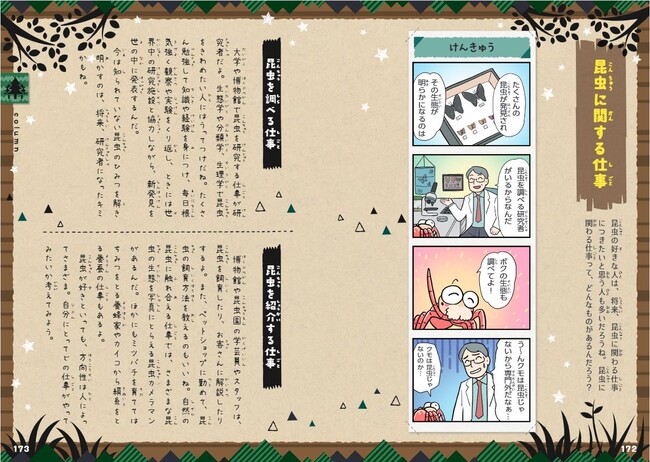どんな人でも普段から目にすることの多い昆虫たちは、その小さい体からは想像もできないほどたくさんのひみつをもち、多様な暮らしをしています。この本を通じて、そんな昆虫たちの魅力に触れていただければと思います。また、身近な昆虫たちもよく観察してみるとこれまで気づけなかった面白さに気が付くことができるかもしれませんよ!