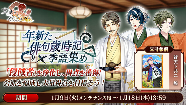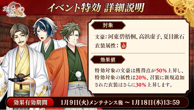 さらに、イベントと同時に開催される限定召装『年新た 俳句歳時記 季語集め』にて新規追加された「高浜虚子」「河東碧梧桐」「夏目漱石」の〈お正月衣装〉を編成すると、得点の獲得率がそれぞれ30%上昇します。