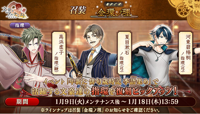 召装『金環ノ理』のラインナップを更新いたしました。この召装では、イベント『特殊調査任務「年新た 俳句歳時記 季語集め」』で活躍する「高浜虚子」「河東碧梧桐」「夏目漱石」の指環を一定の確率で入手できます。