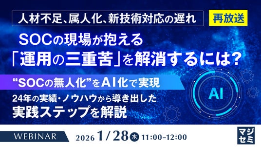マジセミ株式会社は「【再放送】人材不足、属人化、新技術対応の遅れ SOCの現場が抱える「運用の三重苦」を解消するには?」というテーマのウェビナーを開催します。