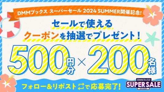 「DMMブックススーパーセール 2024 SUMMER」の開催を記念して、2024年8月8日(木)~同年8月12日(月)23:59までの期間中、DMMブックス公式X(@DMM_DigitalBook)にてフォロー&リポストキャンペーンを開催!抽選でDMMブックスで使える500円分クーポンを、合計200名様にプレゼントいたします。