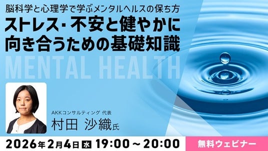 株式会社クリーク・アンド・リバー社(C&R社)は2月4日(水)、不安を感じやすい方や考えすぎて疲れてしまうことが多い方を対象に無料のオンラインセミナー「脳科学と心理学で学ぶメンタルヘルスの保ち方 ~ストレス・不安と健やかに向き合うための基礎知識~」を開催します。