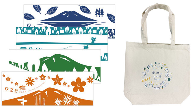オリジナルピンズ応募者の中から、抽選で25名様に尾瀬オリジナルグッズのトートバッグや山小屋手ぬぐいをプレゼント。手ぬぐいは尾瀬の山小屋や、その周辺の景色イメージしたデザインです。(てぬぐいは4種、トートバッグは1種)