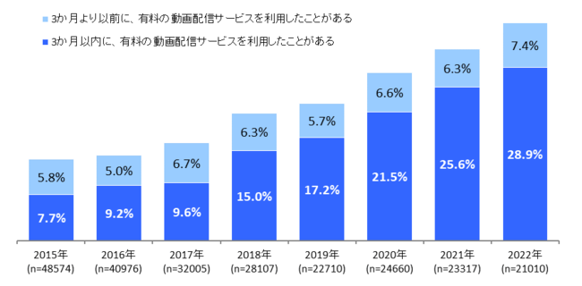 ■有料動画配信サービスの利用率は3.3ポイント増の28.9%に伸長、三分の一が利用経験者に
