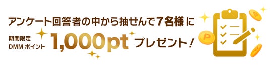 対象期間中に購入後アンケートにご回答いただいた方の中から抽せんで、7名様にDMMポイント1,000ptをプレゼントいたします。