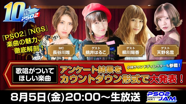 株式会社セガは、オンラインRPG『ファンタシースターオンライン2』(以下、PSO2)において、10周年の特別プロジェクトのひとつとして、『PSO2』『PSO2 ニュージェネシス(以下、NGS)』の楽曲をテーマにした特別番組『PSO2 JAM』を、2022年8月5日(金)20:00より生放送します。