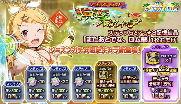 ステップ1では「魔法石500個」で10回ガチャを引くことができ、ステップ2・3・4では「【浜辺で大はしゃぎ】フェルトのかけら」、ステップ5・6・7ではピックアップキャラの出現率が1.5%、ステップ5では記憶結晶「またあとでな、ロム爺★3」のおまけ付き、ステップ7では10連中★3キャラもしくは★3記憶結晶が1枠確定&記憶結晶「またあとでな、ロム爺★3」のおまけが付きます。