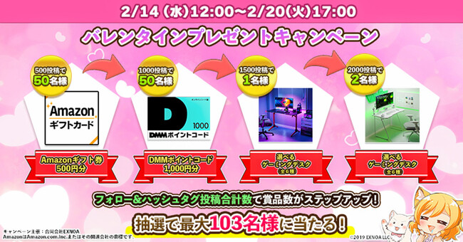 2月14日(水)から開催された「DMM GAMESバレンタインプレゼントキャンペーン」では合計投稿数に応じて賞品数がステップアップし、合計2,000ポストを達成するとDMM.make GAMINGのお好きなゲーミングデスクを抽選で3名様にプレゼントいたします。