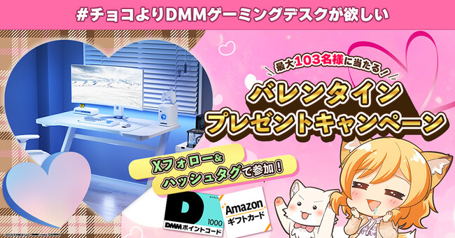 DMM GAMES公式X(@dmmolg_com)をフォローし、ハッシュタグ「#チョコよりDMMゲーミングデスクが欲しい」を入れて投稿することで参加可能。
