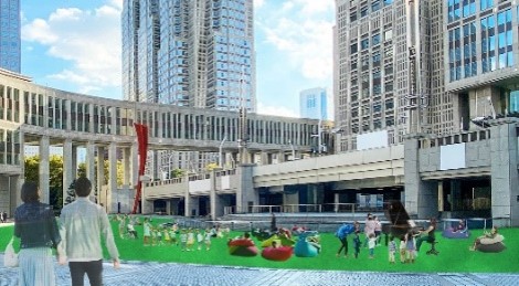 1.都民広場に人工芝を敷きつめ、日替わりでイベントを開催します。