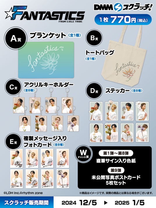合同会社DMM.com(本社:東京都港区、会長 兼 CEO亀山敬司、https://dmm-corp.com/ 以下DMM )は、ハズレなしのオンラインくじサービス「DMMスクラッチ」にて、2024年12月5日(木)より「FANTASTICS スクラッチ第三弾」を販売いたします。本くじでは、DMMスクラッチ限定の多彩なラインナップと共に、メンバーのサイン入り色紙などが抽せんで当たるWチャンス賞を計32日間開催いたします。