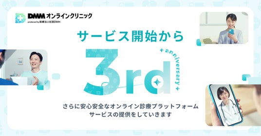 合同会社DMM.com(本社:東京都港区、会長兼CEO:亀山敬司 以下「DMM」)と医療法人社団DMH(理事長:島 佑介)の連携事業であるオンライン診療プラットフォームサービス「DMMオンラインクリニック」(以下「当サービス」)は、2024年12月でサービス開始から3周年を迎えました。