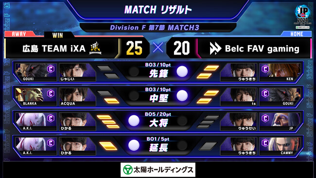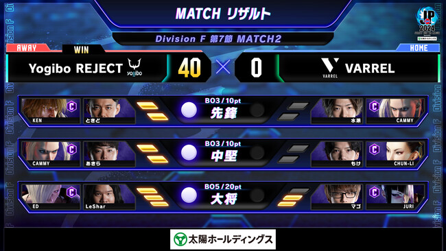 シーソーゲームとなった大将戦の結末は、相手のわずかな隙を逃さず、「確定反撃」を決め、リーサルへとつなげた「LeShar選手」が接戦を制し20ポイントを獲得した。