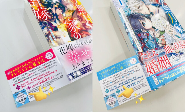 小説2巻とコミック1巻それぞれの帯の折り返しについている応募券を切り取り、2枚を1口としてハガキに貼り、記載の住所宛にお送りください。