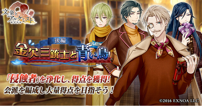 合同会社EXNOA(本社:東京都港区、CEO:村中 悠介、URL:https://games.dmm.com/)が運営するDMM GAMESは、2月22日(木)より、女性向け文豪転生シミュレーションゲーム「文豪とアルケミスト」において、イベント『調査任務「金欠三銃士と青い鳥 後編」』と限定召装『金欠三銃士と青い鳥 後編』を開催いたしました。