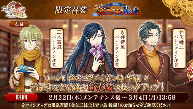 さらに、イベントと同時に開催される限定召装『金欠三銃士と青い鳥 後編』にて新規追加された「永井荷風」「三木露風」「井伏鱒二」の〈バレンタイン洋装〉を編成すると、得点の獲得率がそれぞれ30%上昇します。