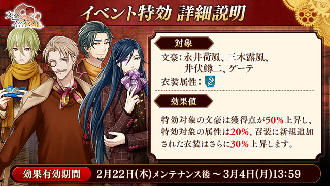 期間中「永井荷風」「三木露風」「井伏鱒二」「ゲーテ」の衣装を編成して潜書すると、得点の獲得数がそれぞれ50%上昇します。また、「水」属性の衣装を編成して潜書すると、得点の獲得数がそれぞれ20%上昇します。