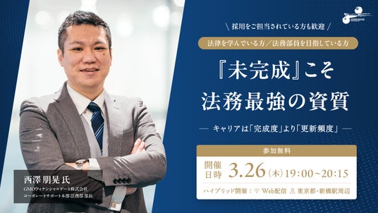 プロフェッショナル・エージェンシー事業を展開する株式会社クリーク・アンド・リバー社(以下C&R社)の法曹分野の子会社 株式会社C&Rリーガル・エージェンシー社(以下CRLA社)は、 2026年3月26日(木)、GMOフィナンシャルゲート株式会社 法務部長の西澤氏を登壇者に迎え、無料セミナー「『未完成』こそ法務最強の資質~ キャリアは”完成度”より”更新頻度” ~」を開催します。本セミナーでは、法律を学んだ方や法務部員をめざしている方、そしてさらなるキャリアアップをめざす法務部員の方を対象に、法務としてのキャリアを歩む上での必要なスキル・素養、さらに自身のキャリアの育て方を解説。年齢や環境に依存せず、“更新が回る人”になるための設計図としてぜひご活用ください。