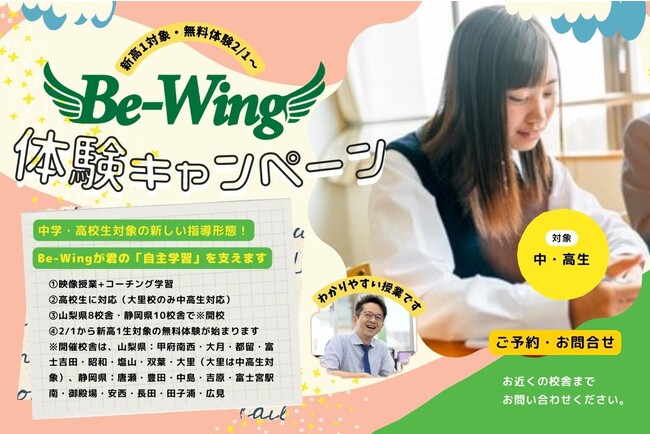株式会社 学研ホールディングス(東京・品川/代表取締役社長:宮原博昭)のグループ会社、株式会社文理学院(山梨・都留/代表取締役社長:小倉勤)は、2/1(水)より新高1生(現中3生)を対象に「Be-Wing」の無料体験を始めます。「Be-Wing(高校生、一部中学生対象)」は今春から始まる文理学院の新しい指導!この機会にぜひお試しください。