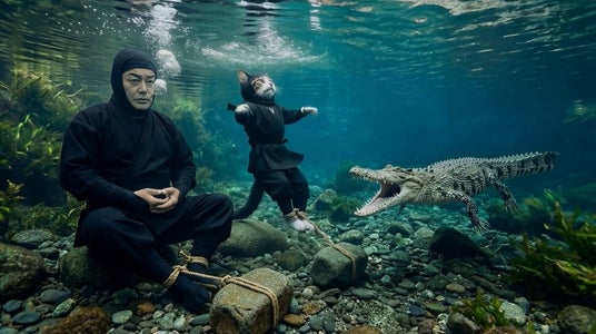 物語は、平穏に暮らしていた細川の愛猫たちが、宿敵「赤忍者」の一団によってさらわれるところから急展開を迎える。細川は愛猫救出のため、険しい修行の末に敵の本拠地へと乗り込む。巨大なワニが潜む水中での精神統一、雪の断崖絶壁を命がけで登る姿など、AIならではの圧倒的なスケールと質感で極限のシーンが展開される。中盤では、デジタルモニターの顔を持つサイボーグ侍や、突如として城が巨大な恐竜型メカへと変形する驚愕のギミックが登場し、宿敵とのサイバーパンクな死闘へと加速していく。