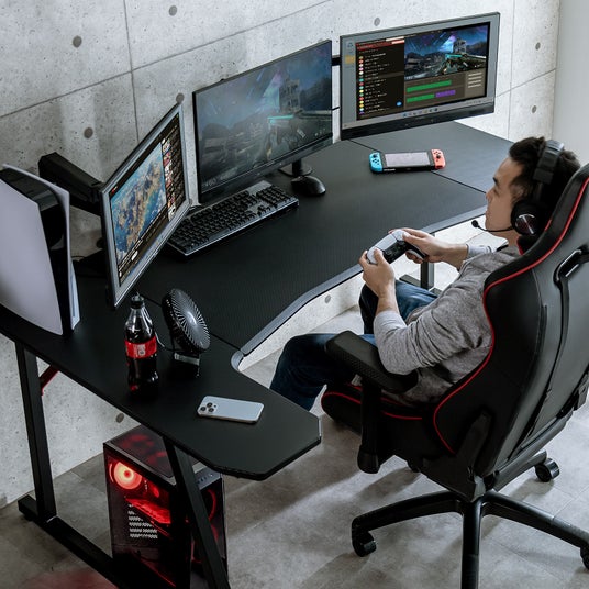超大型天板を採用したゲーミングデスクです。コの字形状のコックピット感があり、悠々と使うことができます。