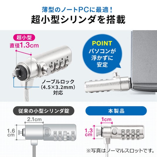 最近のノートPCは薄型化が進んでいて、シリンダーに厚みがあるとガタガタしてセキュリティワイヤーをつけたままノートPCを使うことができません――――