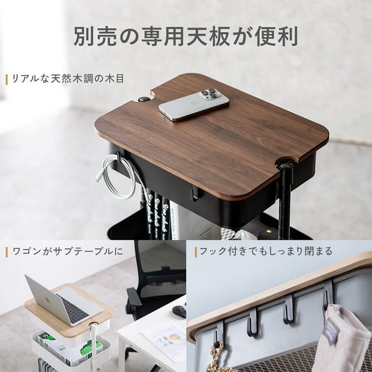 ・ワゴンの縁に引っ掛けて使えるフックが4本付いており、引っ掛けることで収納手段も増える