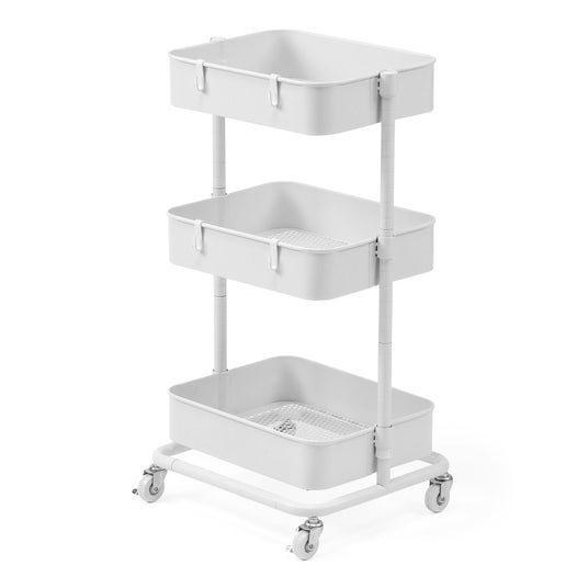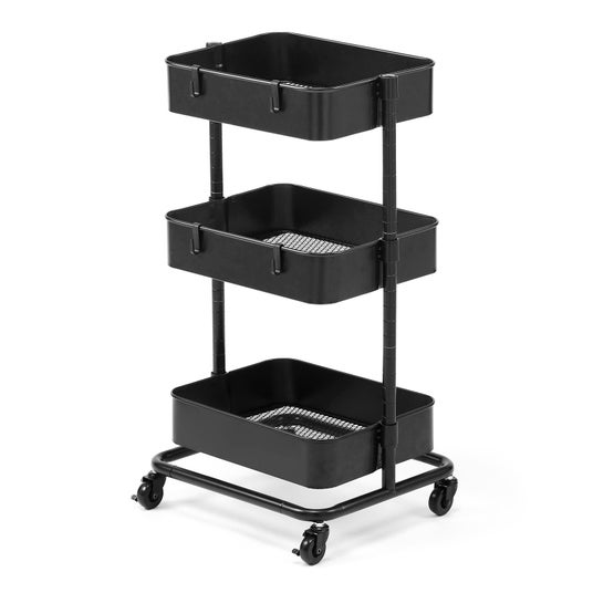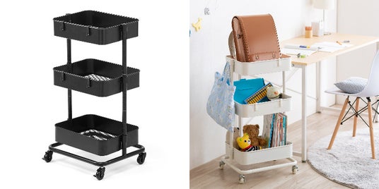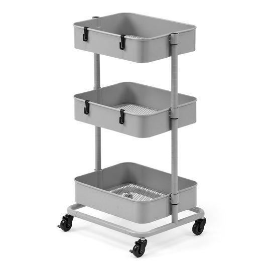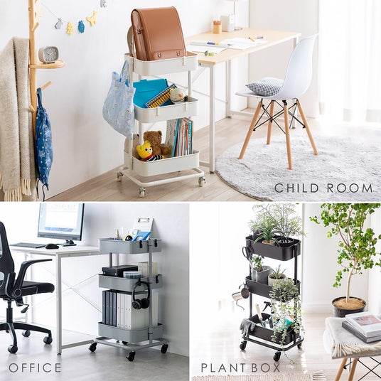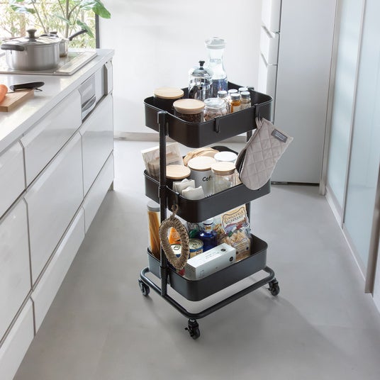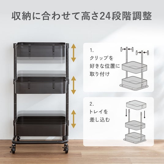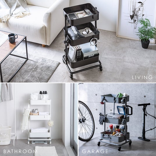 幅42cm、高さを24段階で調整でき、小物の引っかけに便利なフック付、さらにキャスター付きで移動ができて、リビングやキッチンなどに収納可能な3段式キャリーワゴン
