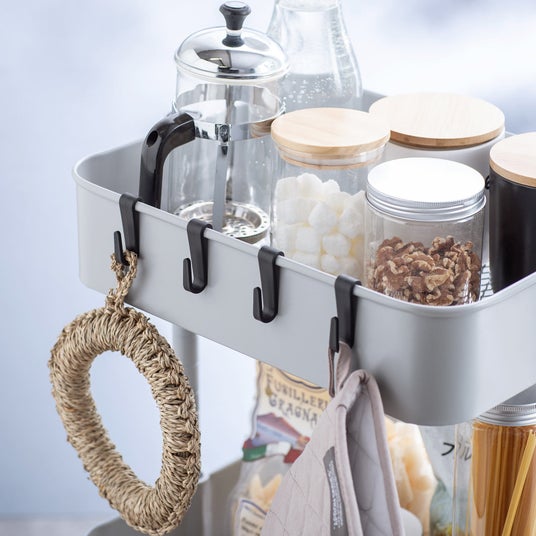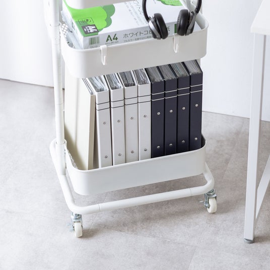 ワゴンの縁に引っ掛けて使えるフックが4本付いており、収納手段がさらに増え、使い勝手が格段に向上します。キッチンなどの小物収納からオフィスでの文具収納まで、幅広く活躍します。