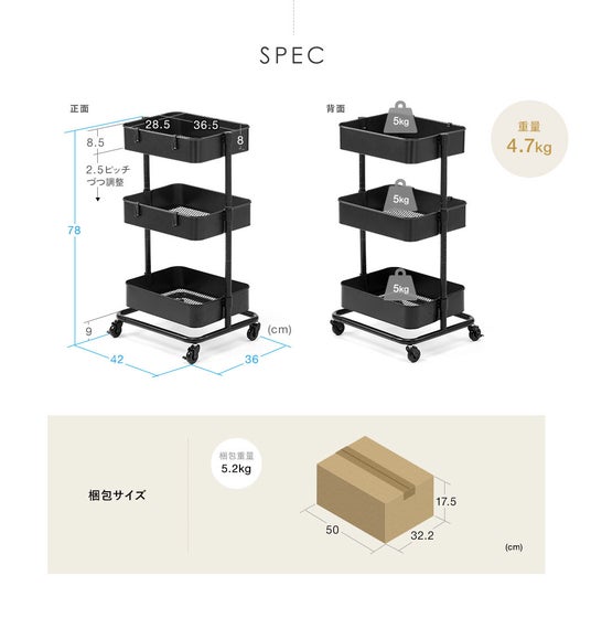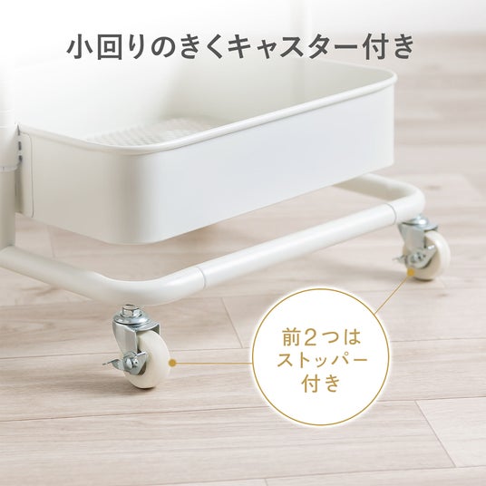 1段あたり約5kg、3段全体で約15kgの耐荷重を誇り、ペットボトルなどの重いアイテムも安心して収納できます。また、ストッパー付きキャスターが付いており、移動と固定が簡単で便利です。