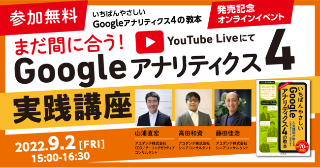 そこで当社では新刊『いちばんやさしいGoogleアナリティクス4の教本』(発売:2022年8月26日)の出版を記念して、本書著者3名による無料オンラインセミナーを実施します。