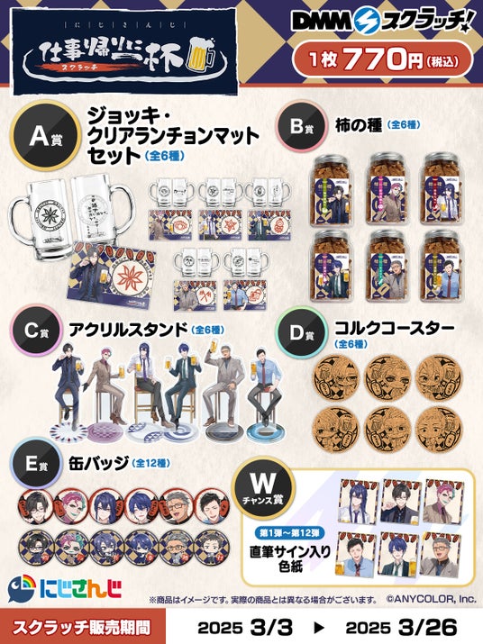 合同会社DMM.com(本社:東京都港区、会長 兼 CEO亀山敬司、https://dmm-corp.com/ 以下DMM )は、ハズレなしのオンラインくじサービス「DMMスクラッチ」にて、2025年3月3日(月)より『にじさんじ「仕事帰りに一杯」 スクラッチ』を販売することをお知らせいたします。本くじでは、DMMスクラッチ限定の多彩なラインナップと共に、ライバーのサイン入り色紙が抽せんで当たるWチャンス賞を計24日間開催いたします。