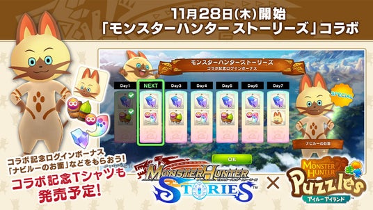 『モンスターハンターパズル アイルーアイランド』では、『モンスターハンター ストーリーズ』とのコラボレーションを記念してアバター用の頭衣装「ナビルーのお面」などがもらえるログインボーナスを2024年11月28日(木)から配布!