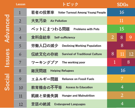 トピック例:若者の投票率(SDGs16)大気汚染(SDGs11)言語の絶滅(SDGs4)など